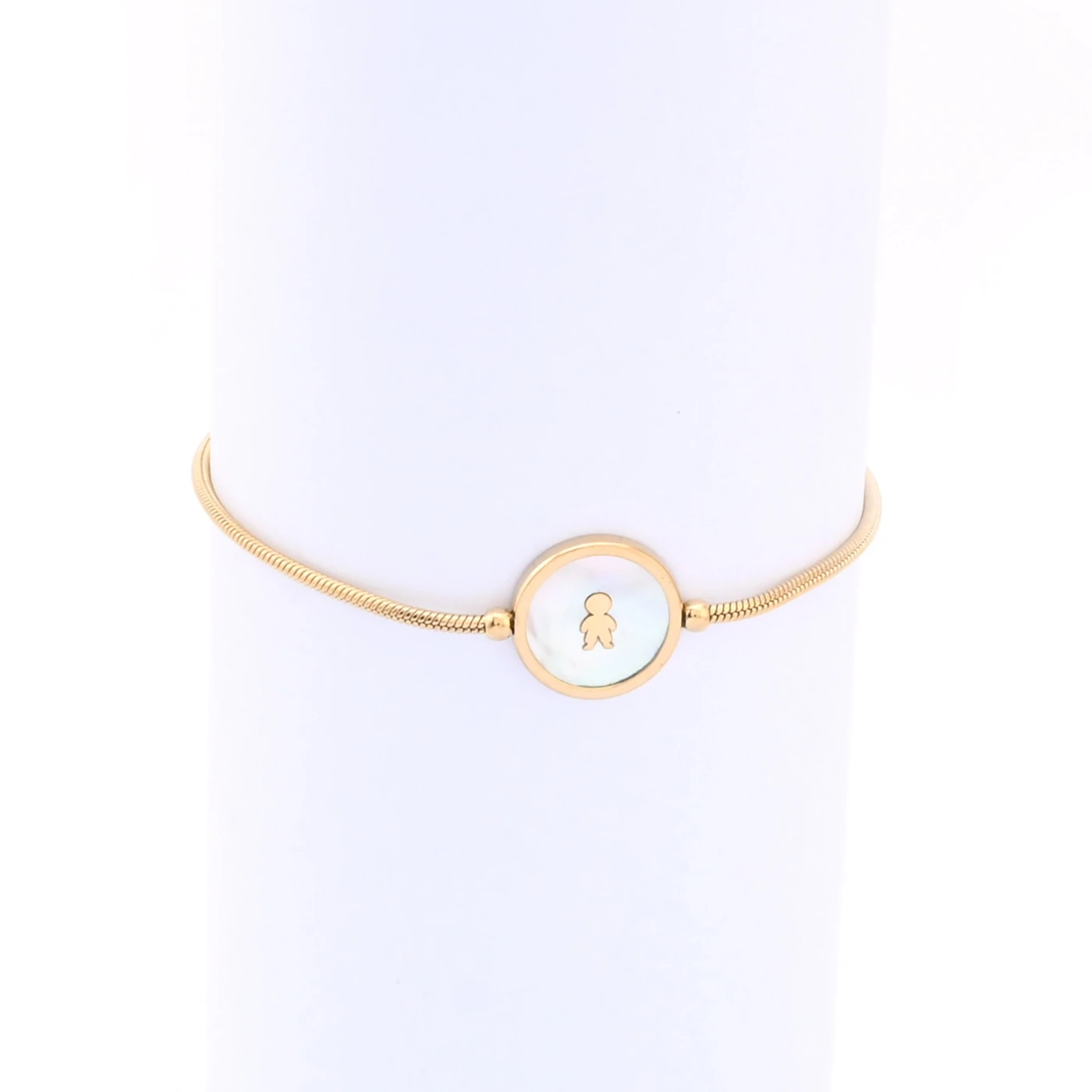 Pulseira ajustável em aço inoxidável com madrepérola constituída por um menino. Coleção família.